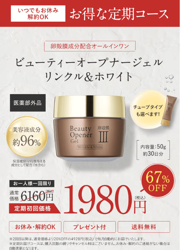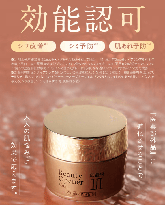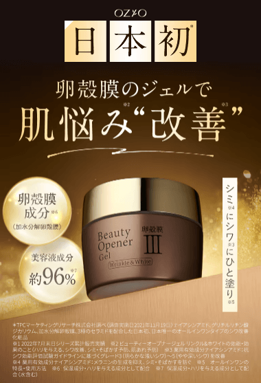 そんな悩みを持つ女性で話題のアイテムが、卵殻膜成分配合のオールインワンジェル「ビューティーオープナージェルリンクル&ホワイト」。